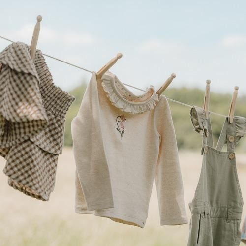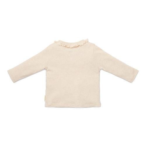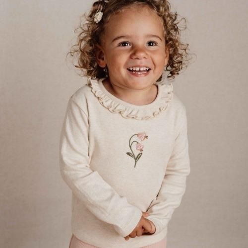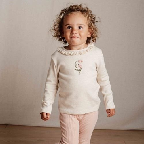 Lascia che la tua immaginazione fiorisca! Questa graziosa t-shirt a maniche lunghe in un affascinante colore sabbia melange presenta un bellissimo ricamo di fiori di fattoria sul davanti. Lo scollo è impreziosito da delicate ruches, che aggiungono un tocco giocoso. Realizzato in cotone biologico e disponibile nelle taglie 74, 80, 86, 92, 98 e 104. Progettata per abbinarsi perfettamente a qualsiasi capo della collezione coordinata Farm, questa t-shirt offre infinite possibilità di mix-and-match.