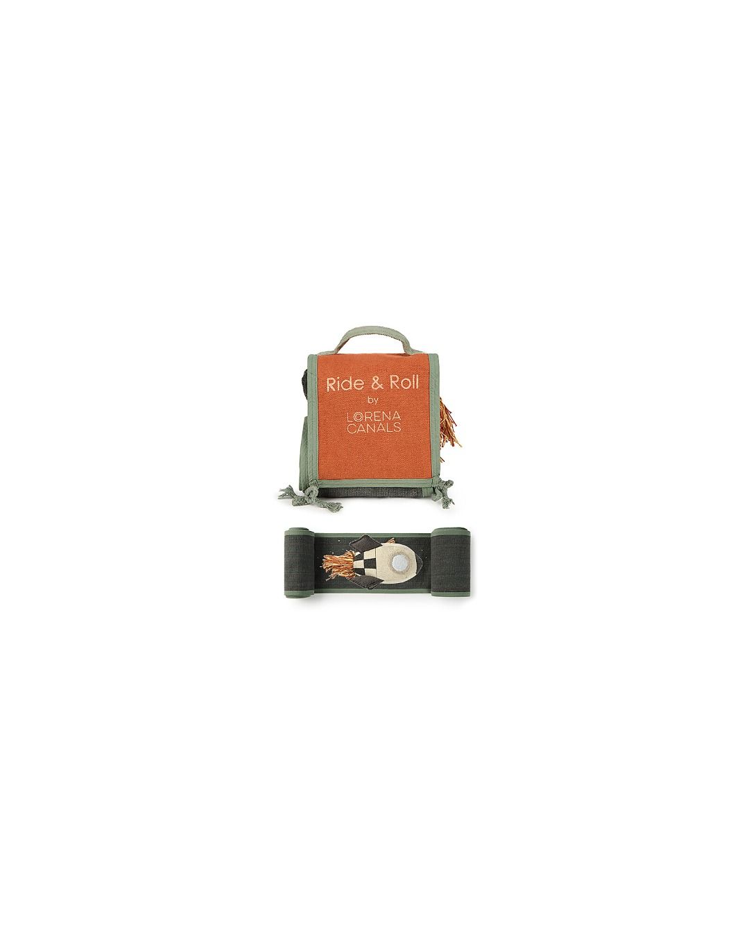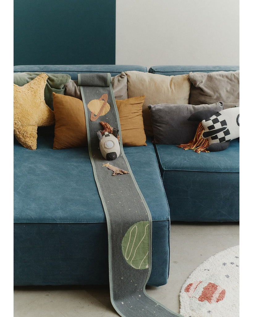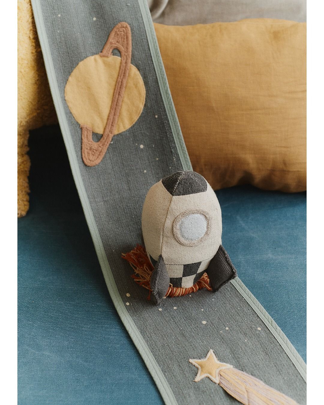 Intraprendi un fantastico viaggio nello spazio con il Milkyway Ride & Roll! Questo giocattolo tessile fatto a mano presenta un morbido razzo realizzato in tela di cotone naturale e grigio scuro, con bordi sfrangiati che sembrano fiamme di razzo. Si srotola da una base di tela di 4 metri nei colori grigio scuro e petrolio, mostrando elementi dettagliati come pianeti tufted, toppe per pianeti in tela, corde cucite, un UFO in tela con luci tufted giocose e una stella cadente con streamer colorati.