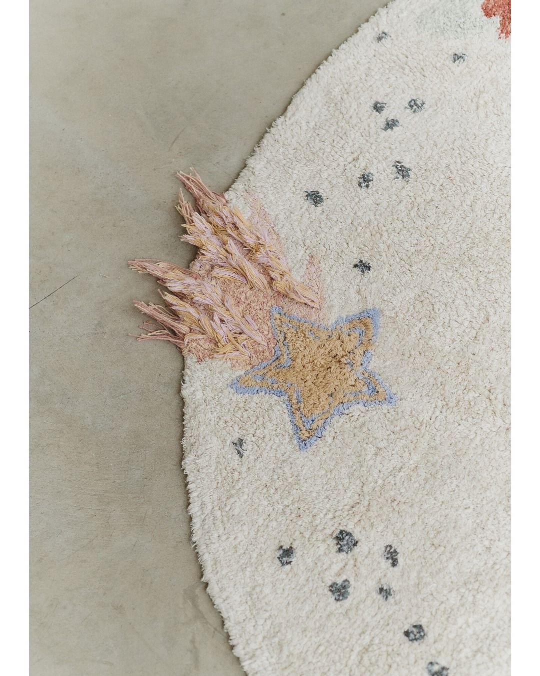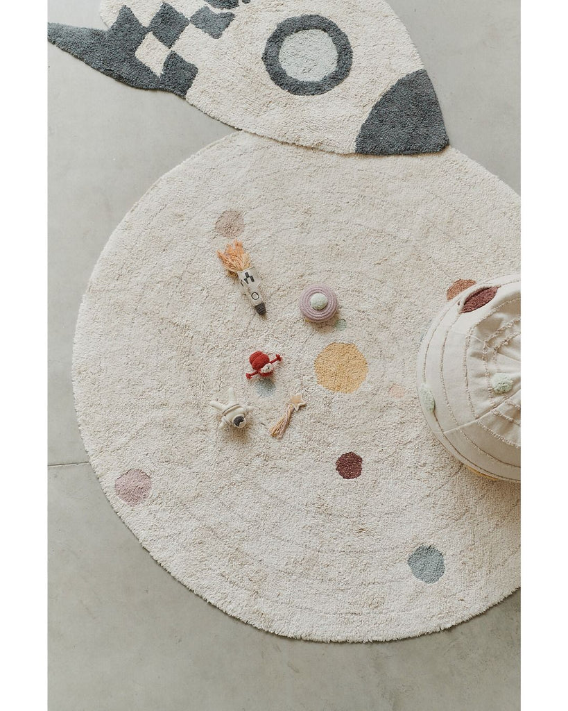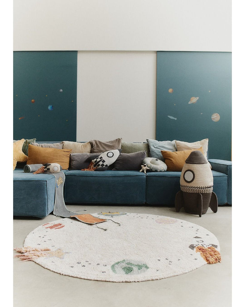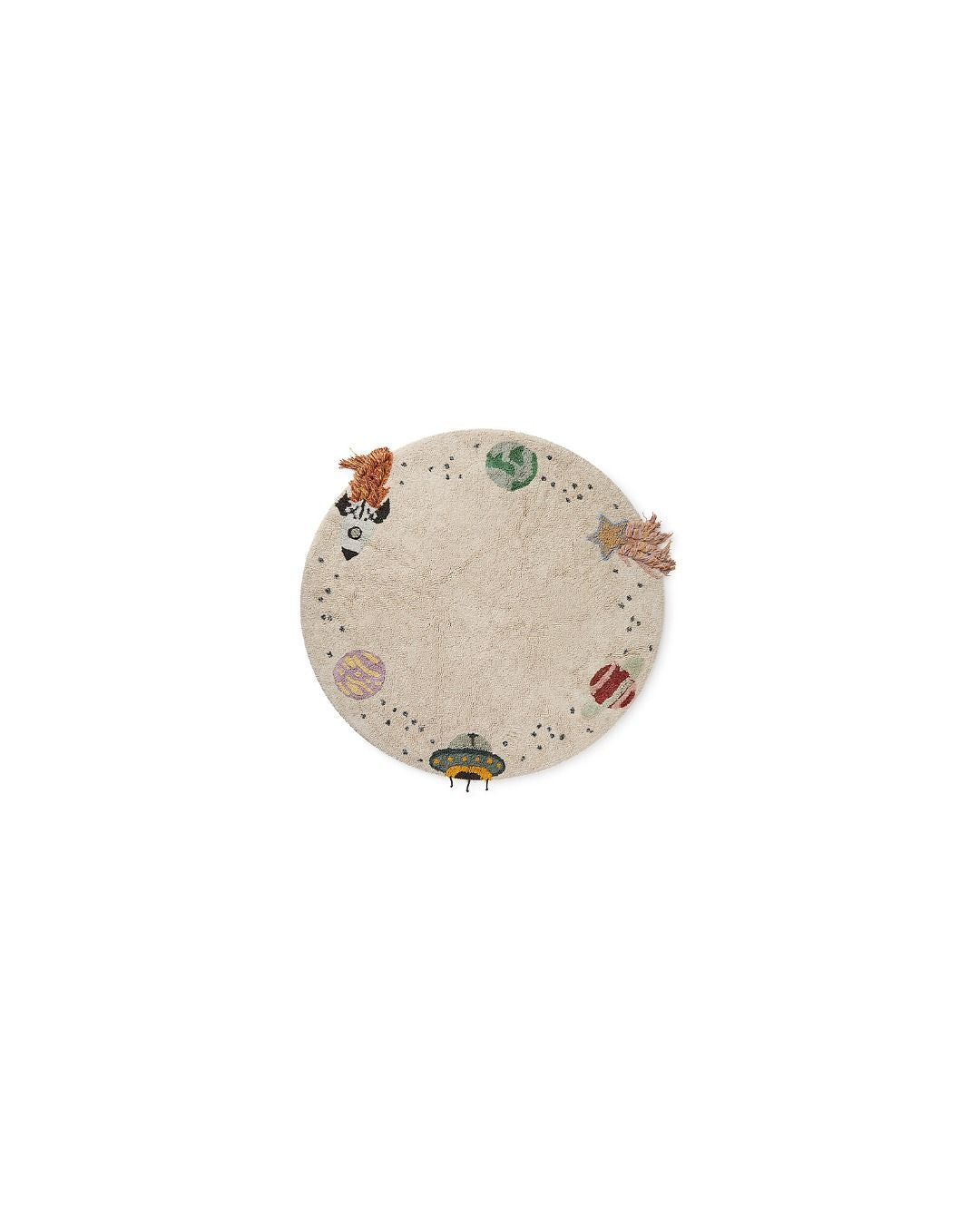 Trasforma la stanza di tuo figlio in un'avventura spaziale con questo tappeto in tela naturale interstellare. Con deliziosi disegni lungo il bordo che raffigurano tre pianeti, un razzo, una stella cadente e un UFO, questo tappeto è perfetto per i giovani esploratori e aspiranti astronauti.