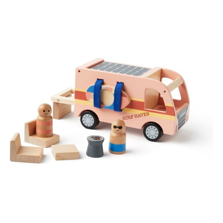 Camper Van AIDEN in legno certificato FSC. Il veicolo ha molte caratteristiche e dettagli diversi. Il pannello solare sul tetto può trasformarsi in una spiaggia se lo si capovolge. La porta sul retro può fungere da terrazza solarium su cui sedersi fino al tramonto. Sono incluse due sedie, un tavolo, una griglia e una tavola da surf. Le figure che viaggiano da queste parti sono Joel e Saga, che sono dei veri e propri globetrotter. Stanno vivendo la loro vita migliore e hanno restaurato e trasformato un vecchio pick-up, sistemato l'interno e dipinto l'esterno con colori vivaci e solari. Saga ha costruito un supporto per la sua tavola da surf sul lato del veicolo e naviga ogni volta che ne ha la possibilità. Con il loro furgone hanno creato un'oasi, qualcosa che possono portare con sé ovunque vadano. Uno dei loro motti nella vita è "volgi il viso verso il sole e non vedrai mai le ombre". Stimola la fantasia e il gioco di ruolo dove tutto è possibile.