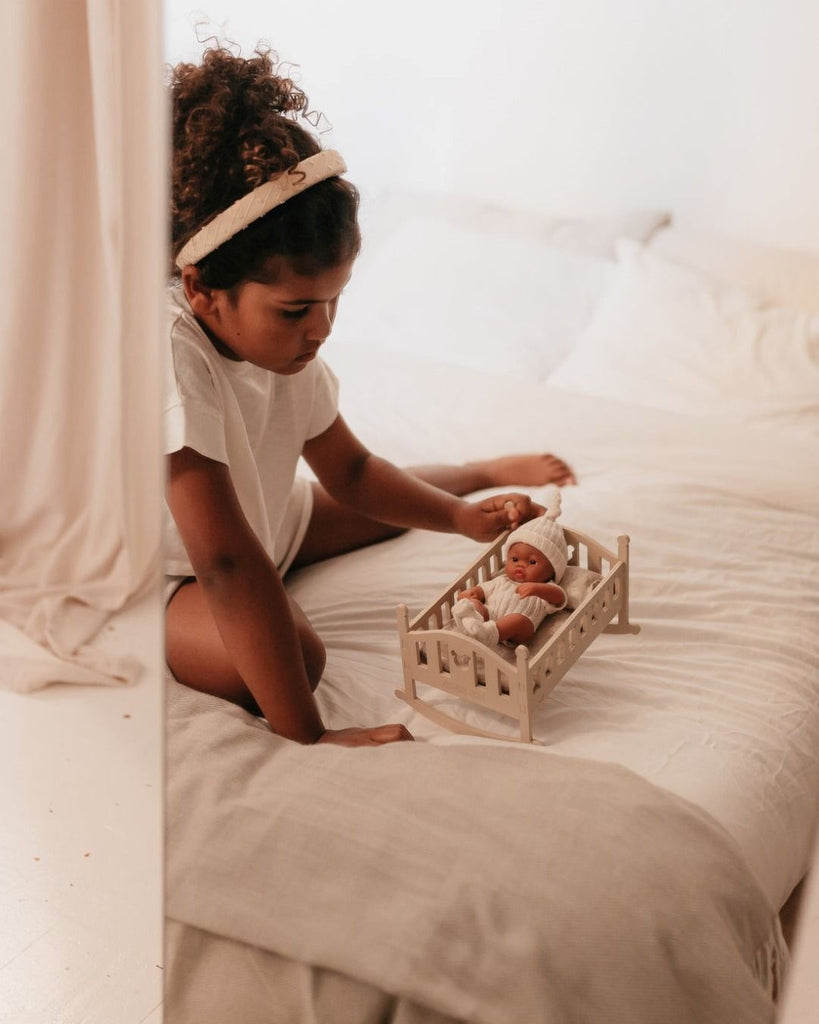 Le lupitas sono bambole estremamente malleabili e leggere. Misurano 20 cm, sono dotate di lettino a dondolo in legno e biancheria da letto (materasso, cuscino e lenzuolo)