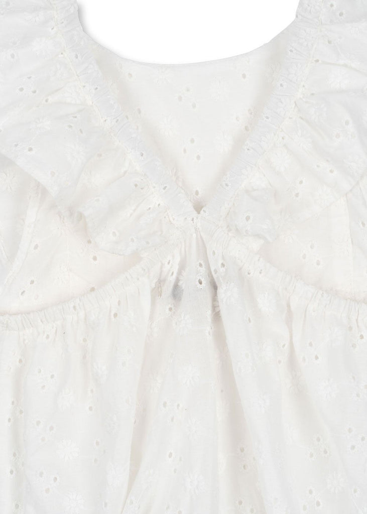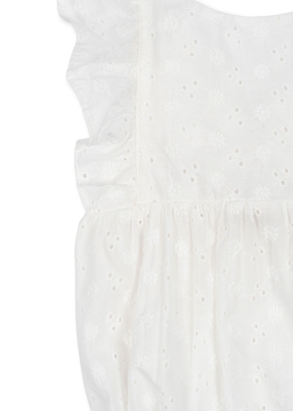 Tutina smanicata in classico sangallo con volant lungo le spalle e le cosce. Progettato con cinturini incrociati sul retro e bottoni a pressione sul cavallo per una facile vestizione. Materiale: 100% cotone.