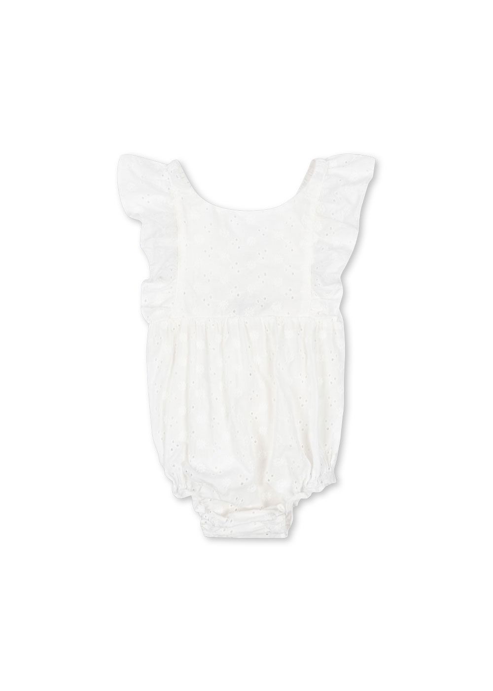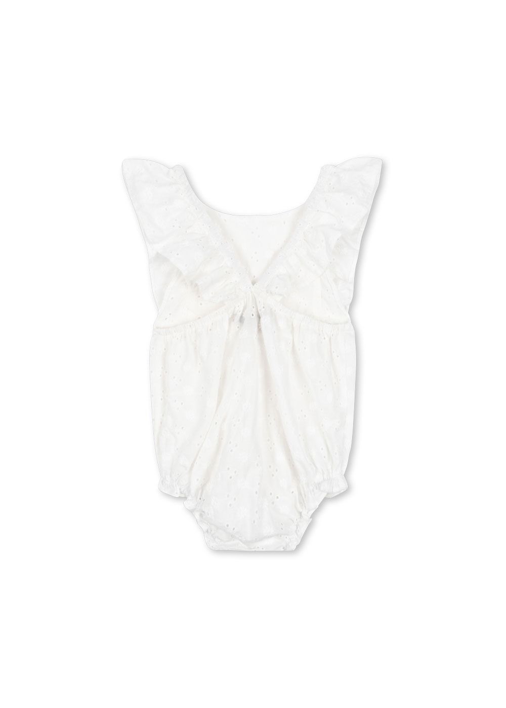 Tutina smanicata in classico sangallo con volant lungo le spalle e le cosce. Progettato con cinturini incrociati sul retro e bottoni a pressione sul cavallo per una facile vestizione. Materiale: 100% cotone.