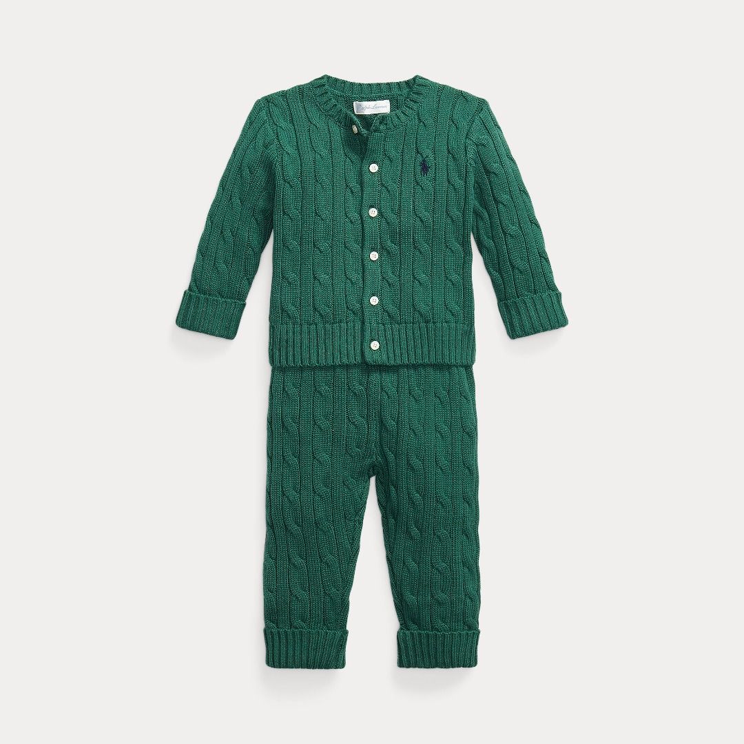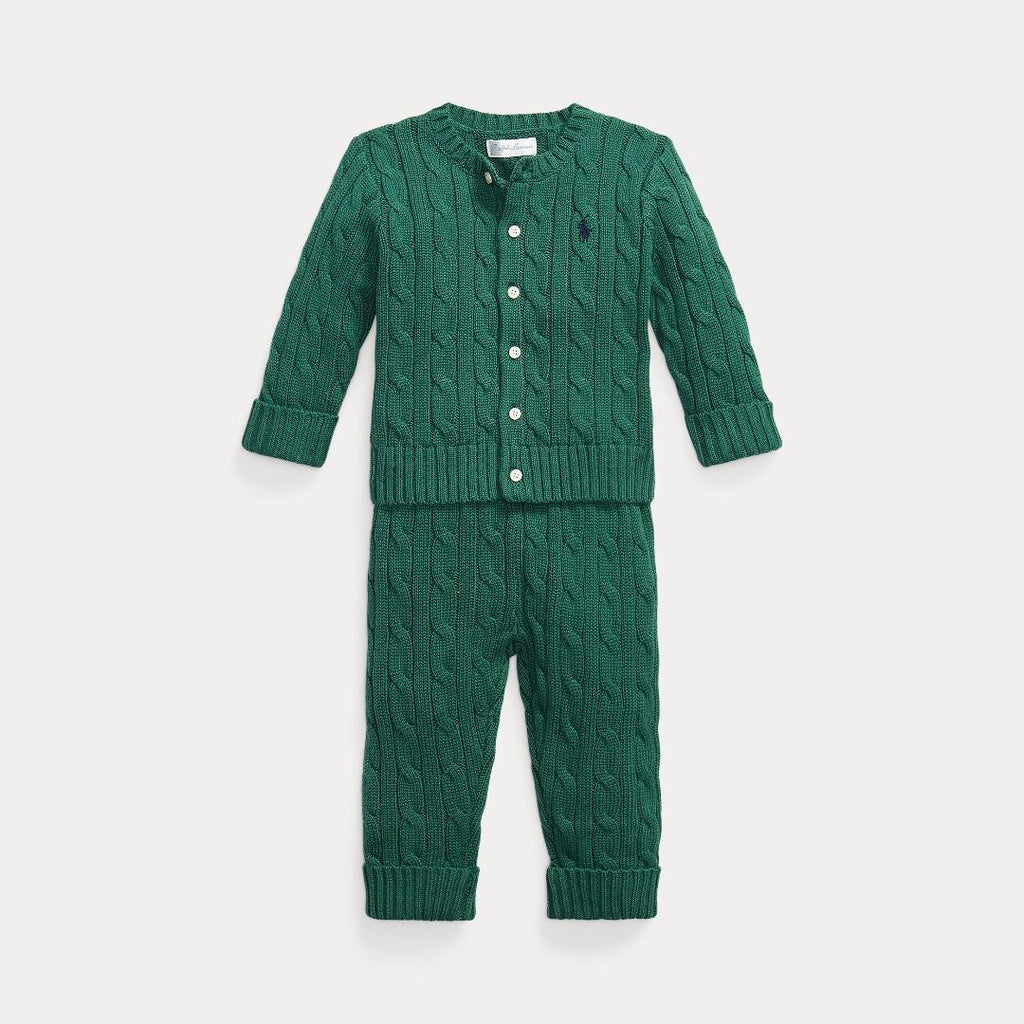 Questo adorabile set include un cardigan girocollo e pantaloni abbinati, entrambi realizzati in cotone pettinato di peso medio.