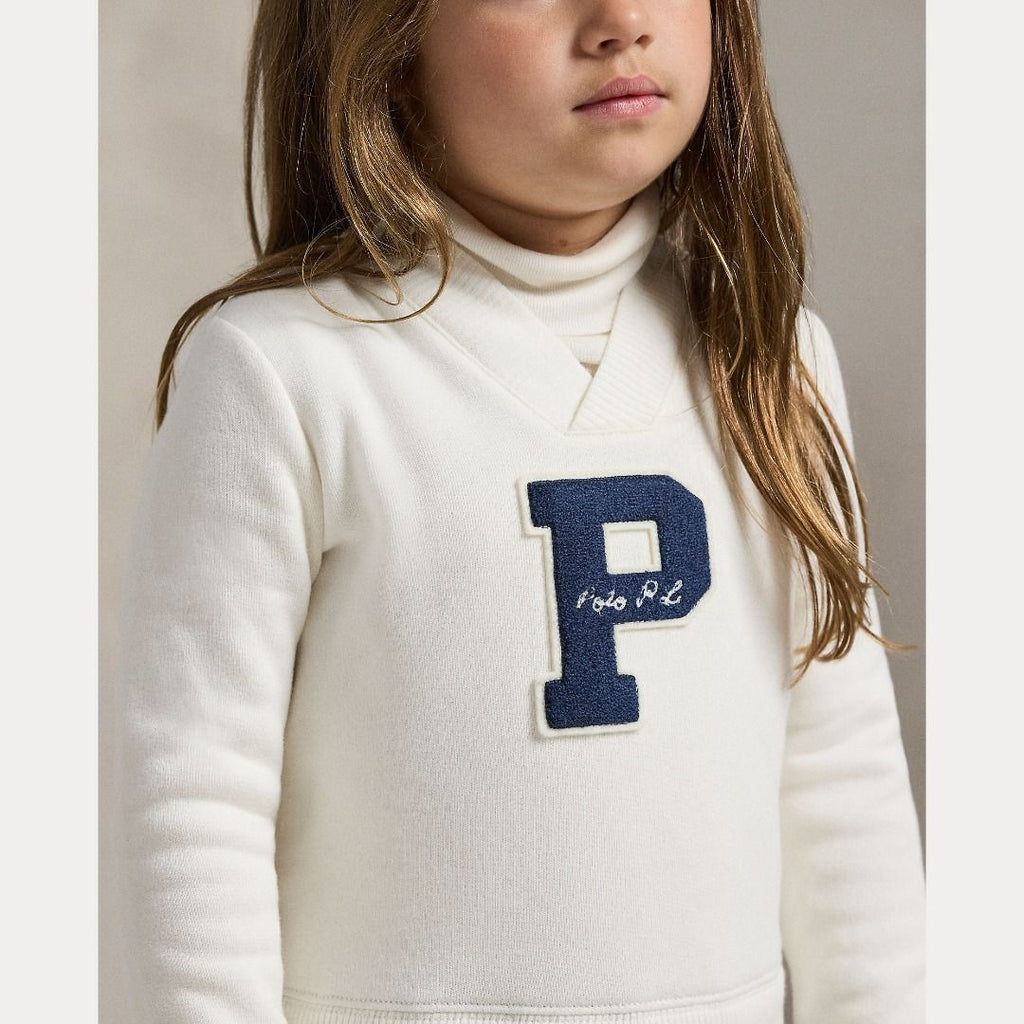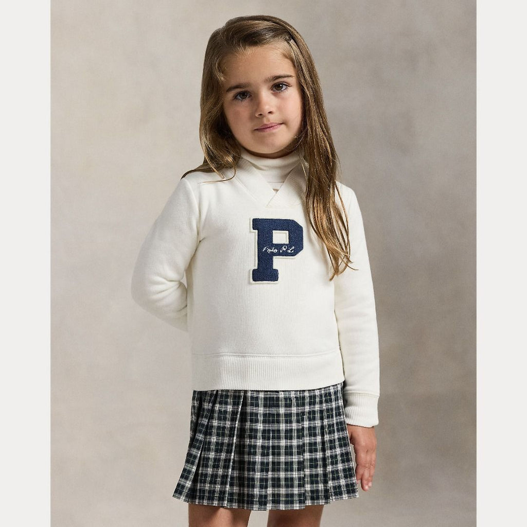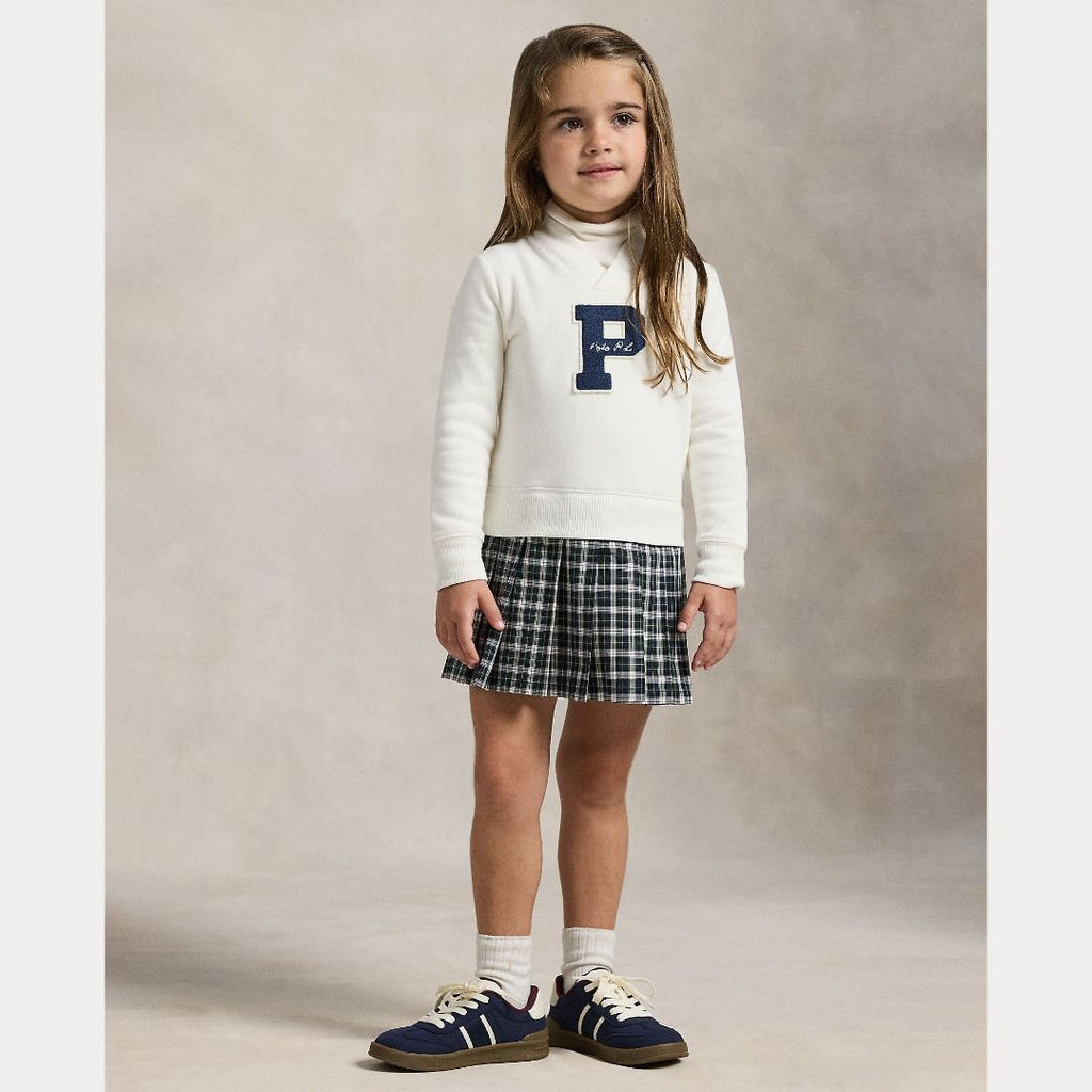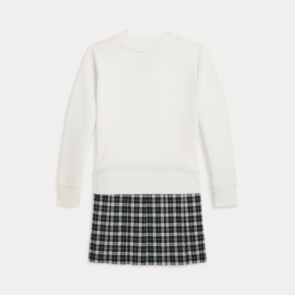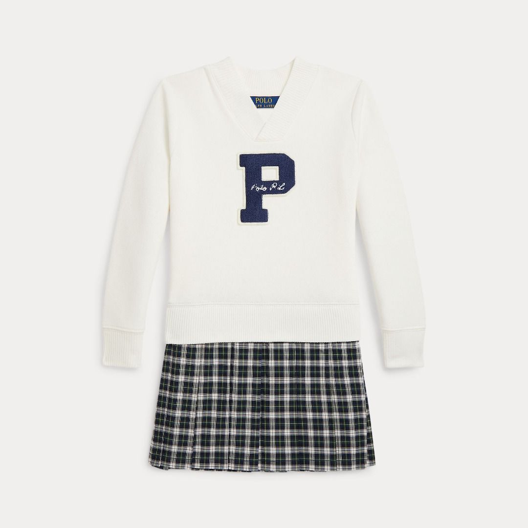 Parte del concetto ispirato alla scuola di preparazione della stagione, questo vestito combina il comfort di una felpa in pile color pesca con una gonna a quadri plissettata. Sul davanti, presenta un'iconica toppa in stile letterman.