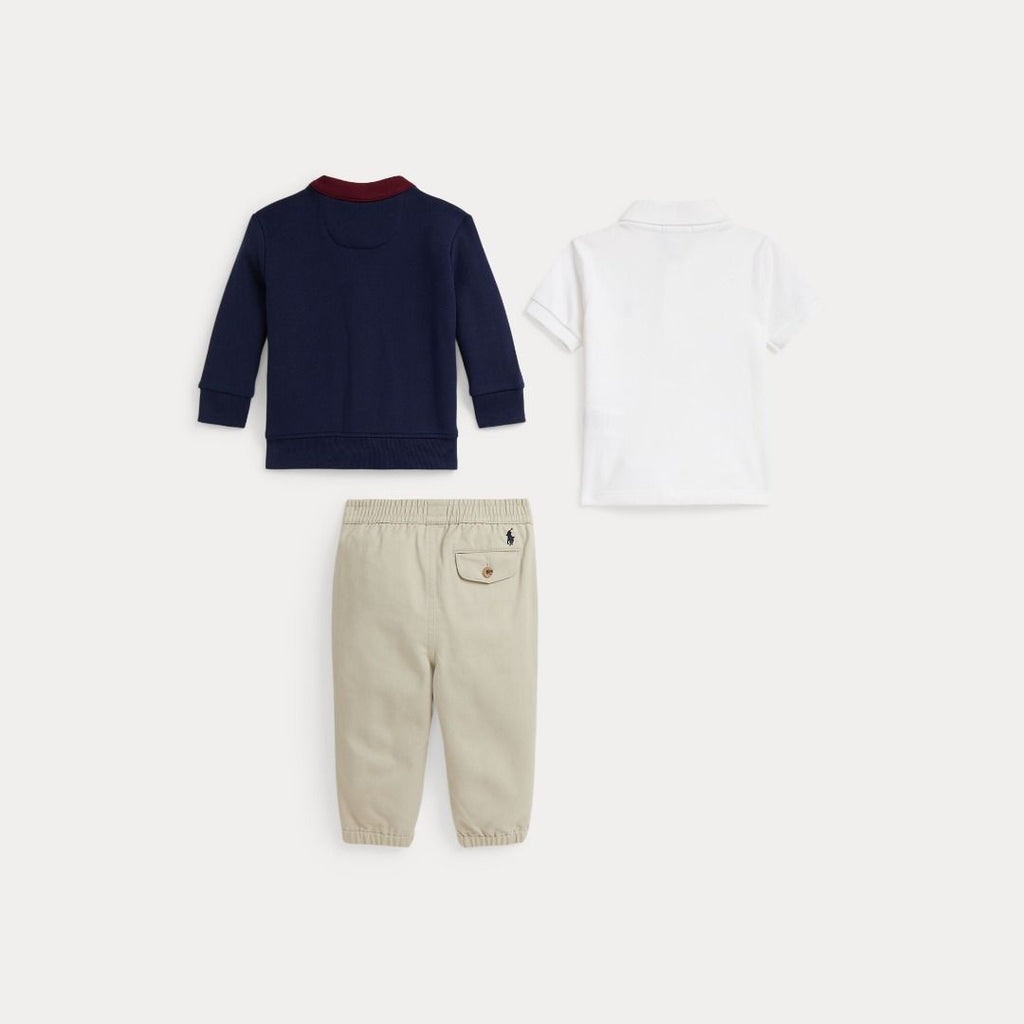 Questo elegante set offre una polo in rete di cotone, pantaloni chino e un cardigan in pile con una toppa con lettere.
