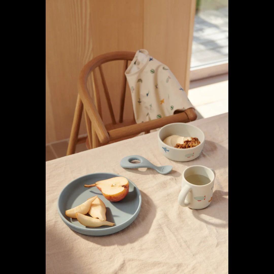 Tutte le nostre stoviglie più popolari, raccolte in un unico comodo set. Realizzato in silicone resistente e di alta qualità, il set di stoviglie Vivi è infrangibile e lavabile in lavastoviglie. Consiste in una tazza, una ciotola, un piatto e un cucchiaio, assicurando che il tuo piccolo sia pronto per le sue avventure gastronomiche.
