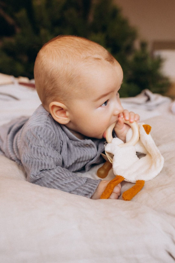 Delizia il tuo piccolo con il nostro giocattolo a forma di oca increspata, progettato per stimolare e intrattenere con il suo suono morbido e increspato e il suo design adorabile. Realizzato con materiali sicuri e adatti ai bambini, questo affascinante giocattolo a forma di oca offre un coinvolgimento sensoriale che incoraggia l'esplorazione e la curiosità. Mentre il tuo bambino stringe o manipola il giocattolo, il suono increspato catturerà la sua attenzione, aiutandolo a sviluppare le capacità uditive e la coordinazione occhio-mano. Dimensioni: 18 cm. Fatto con amore in Lettonia (UE). Materiale: Tessuto – 100% cotone organico. Materiale increspato: pellicola frusciante. Anello di legno: 6 cm. Istruzioni per la cura: Lavare in lavatrice a 40°C con colori simili, non asciugare in asciugatrice. Nota: il colore del prodotto potrebbe differire leggermente da quello mostrato in figura.