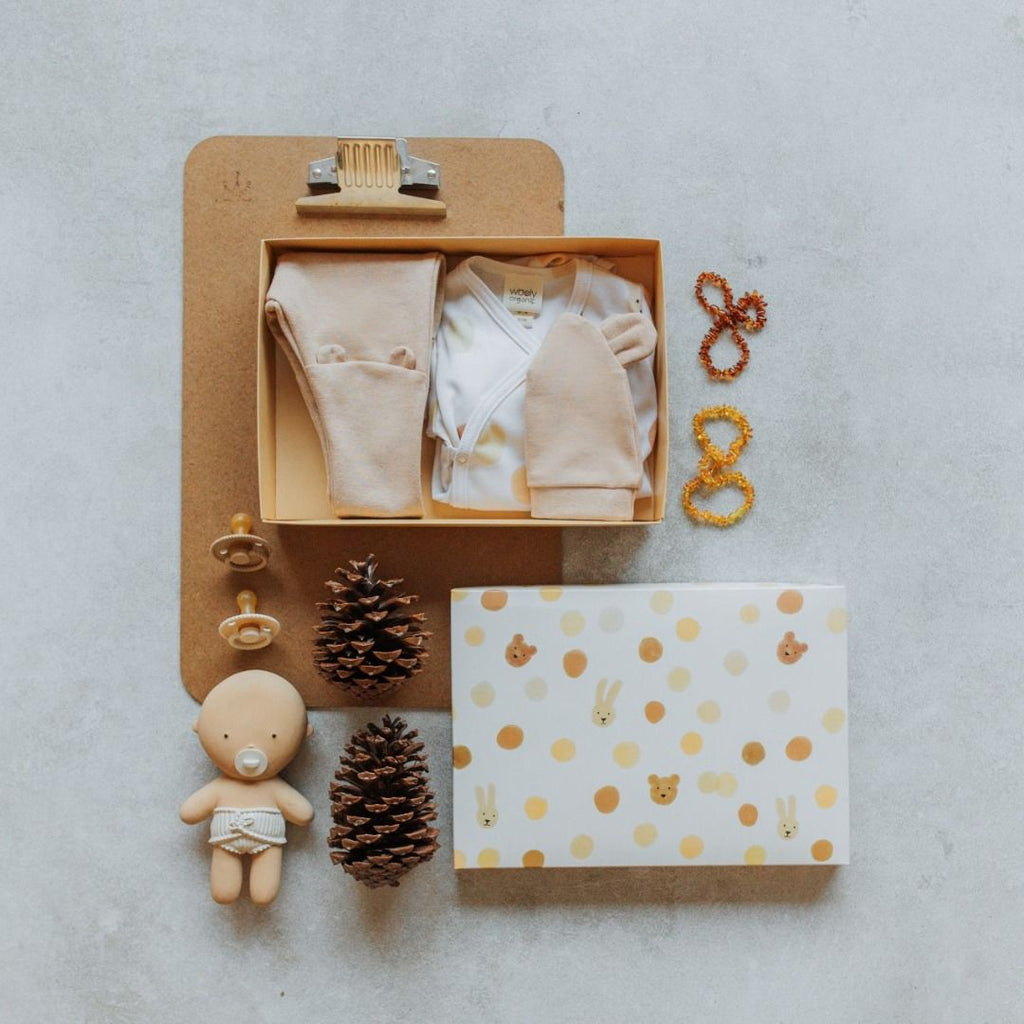 Box set composta da scatola, body, cappellino e leggins unisex.