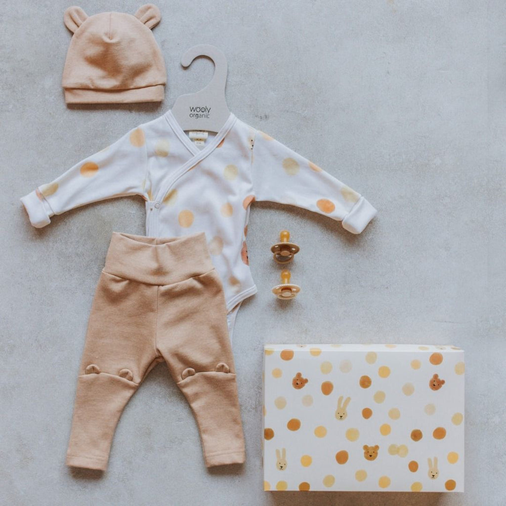 GIFT SET2 - LEGGINGS AND BABY BEANIE HAT WITH TEDDY EARS 1x1 RIB, LONGSLEEVE WRAP BODYSUIT - GOTS