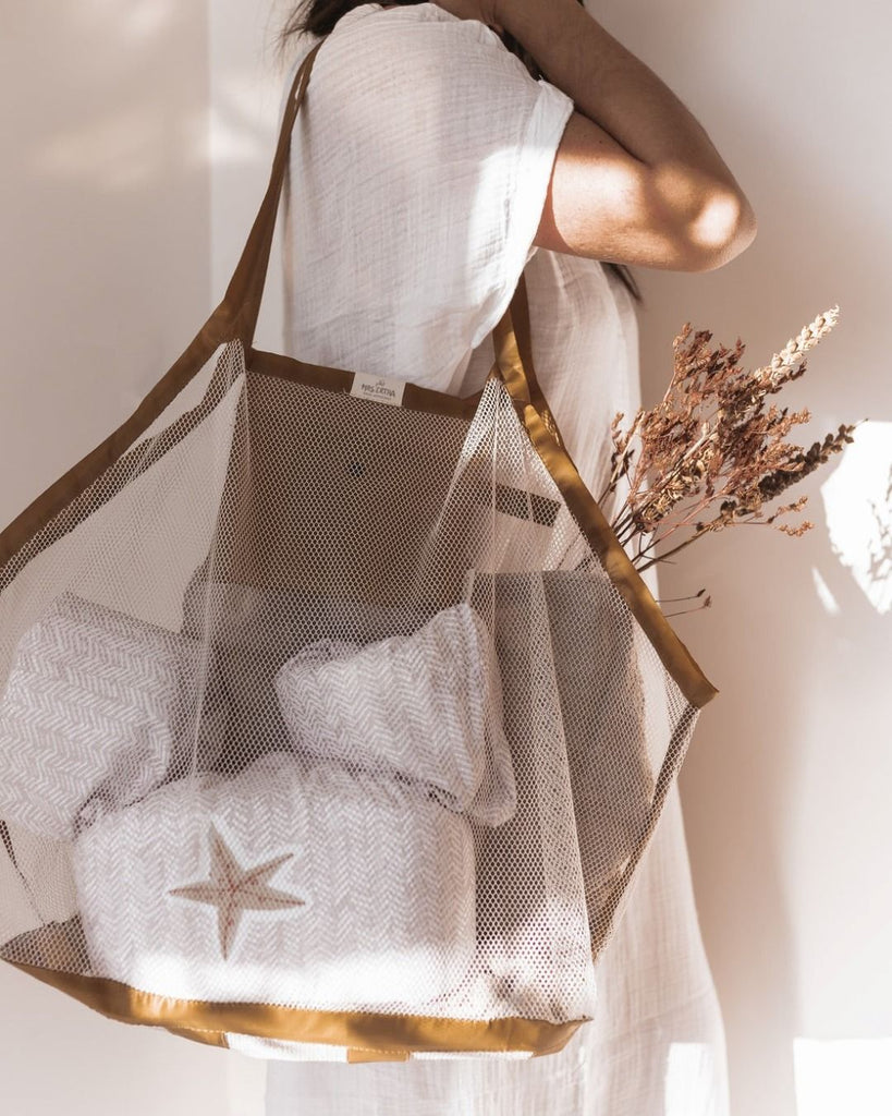 Realizzate in poliestere riciclato, le nostre borse a rete sono l'accessorio più pratico che puoi portare in spiaggia e riporre tutti i tuoi giocattoli, asciugamani e accessori. Sono dotati di una borsa che, una volta aperta, si trasforma in una borsa a rete XL di dimensioni 60 x 40 cm. Super funzionale e capiente, è dotato di una piccola tasca dove riporre i tuoi oggetti più delicati.